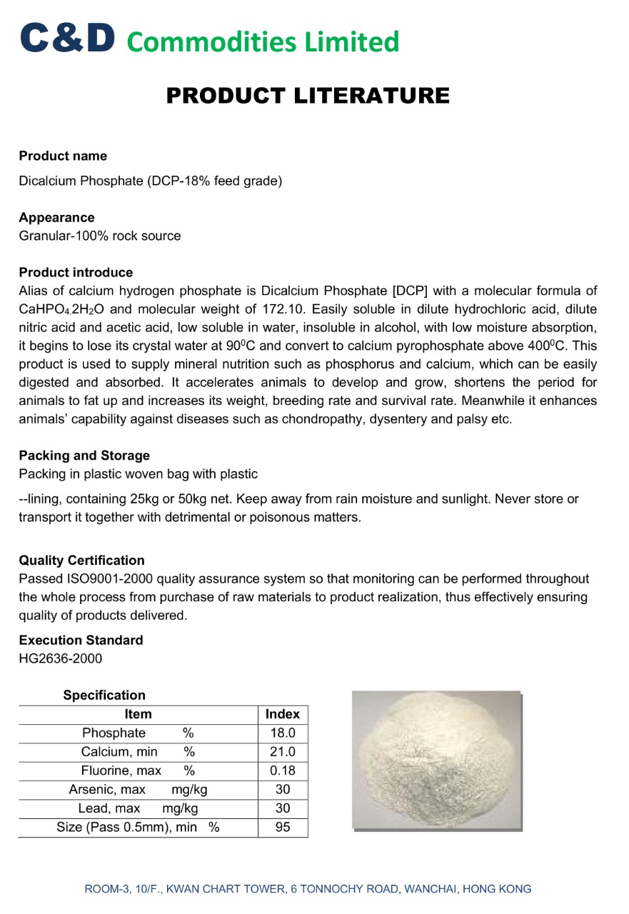 Alias of calcium hydrogen phosphate is Dicalcium Phosphate [DCP] with a molecular formula of CaHPO42H2O and molecular weight of 172.10. Easily soluble in dilute hydrochloric acid, dilute nitric acid and acetic acid, low soluble in water, insoluble in alcohol, with low moisture absorption, it begins to lose its crystal water at 90°C and convert to calcium pyrophosphate above 400°C. This product is used to supply mineral nutrition such as phosphorus and calcium, which can be easily digested and absorbed. It accelerates animals to develop and grow, shortens the period for animals to fat up and increases its weight, breeding rate and survival rate. Meanwhile it enhances animals' capability against diseases such as chondropathy, dysentery and palsy etc.